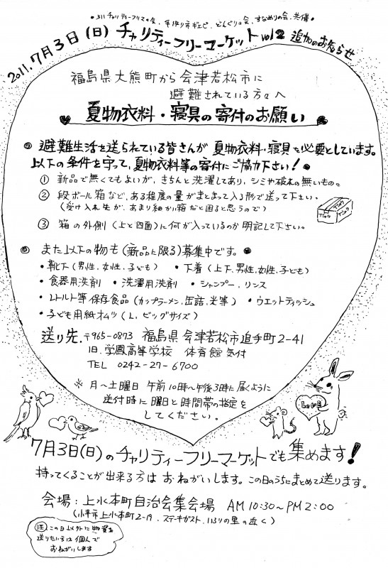 7月3日に開催する<チャリティフリーマーケットvol.2>では、当日、福島で避難されている方向けに以下のような品物を受け付けます。当日、ご来場の方で品物を寄付していただける方は、是非、以下の要領を読んでご持参下さい。または、個人で送られる方も情報を参考になさってください。